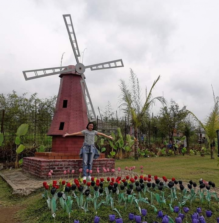 Foto penulis artikel di replica Keukenhof park Holland. Replica kebun tulip dan kincir angin Belanda.