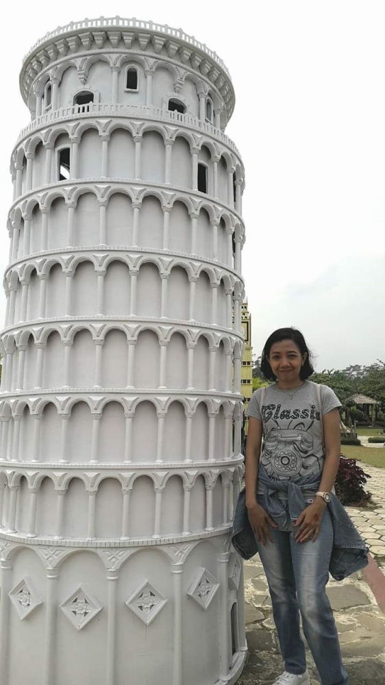 Foto penulis artikel di replica Menara Pisa, Italia.