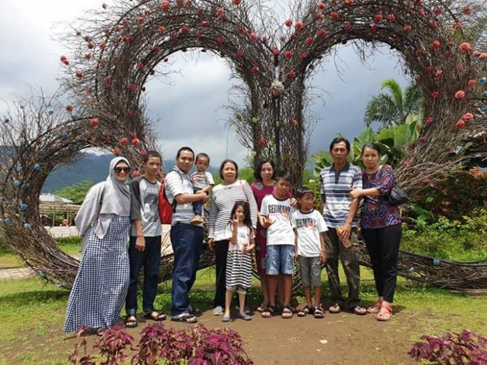 Foto bersama keluarga bu Mardiyah bersama anak-anak dan cucu-cucu di Gerbang masuk Small World Ketenger Baturraden. Photo by Ari