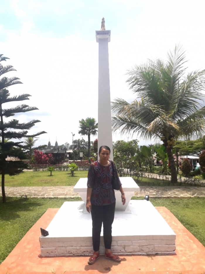 Foto kakak saya di depan miniatur Monas di Small World. Photo by Ari
